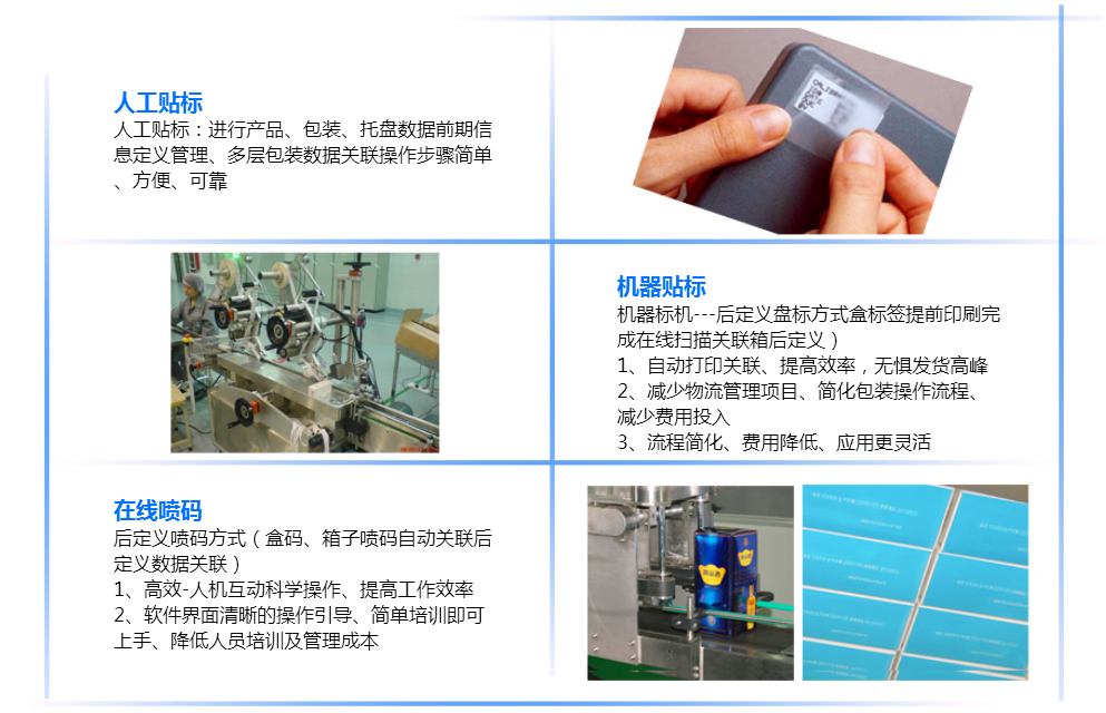第一步--------------------------------------建立防竄貨管理系統(tǒng)、采用條碼、二維碼標簽對產品的數(shù)據(jù)管理。 第二步--------------------------------------每件產品賦予身份號碼、建立一對一的數(shù)據(jù)關聯(lián)、分區(qū)域進行數(shù)據(jù)管理。 第三步--------------------------------------通過對每件產品、包裝箱以及托盤貼標、進行相關聯(lián)套碼管理。 第四步--------------------------------------進行人工或者機器貼標、在線噴碼根據(jù)數(shù)據(jù)定義分銷產品。 第五步--------------------------------------產品出庫入庫自動化數(shù)據(jù)采集、確保企業(yè)及時掌握產品流動方向全程數(shù)據(jù)監(jiān)控、對產品進行追蹤溯源。 第六步--------------------------------------防竄貨系統(tǒng)提供經銷商查詢、稽查查詢、消費者查詢,快速獲取產品分銷區(qū)域及竄貨信息。 |